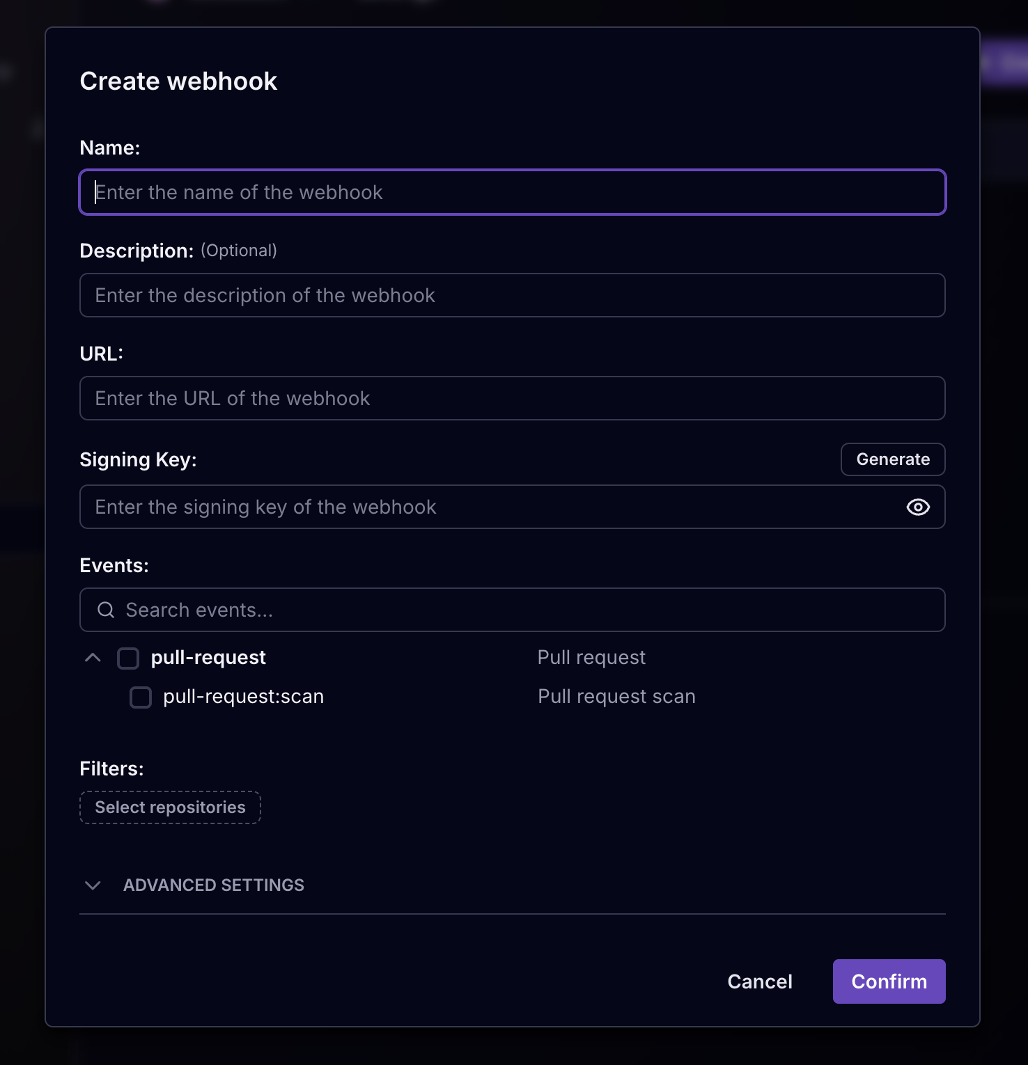 - Select "Webhooks" in the menu (under “Integrations”) and click “Create webhook”.