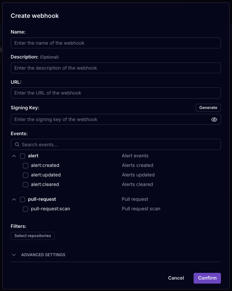 - The signing key is required and will allow you to verify the webhook payload. See "Verify the webhook payload" below. You can either fill in your own key, or generate one and copy it to your receiving system. See "Webhook signing key" below.